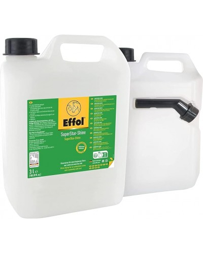 Effol SuperStar-Shine, atınıza her zamankinden daha parlak bir görüntü verecek, etkinin birkaç gün sürmesi test edilmiştir. Parlatıcı Sprey, bakım sırasında neredeyse hiç çaba harcamadan karmaşık ve dolanmış yele ve kuyrukları açmanıza ve talaş, saman vb. temizlemenin yanı sıra daha fazla hacim kazanmasını sağlayacaktır. Ayrıca dolaşmış, kuru yele ve kuyruk sorununu da başarıyla çözmektedtir. Cilt dostu olması dermatolojik olarak test edilmiş ve "çok iyi" olarak sınıflandırılmıştır. 3 lt.